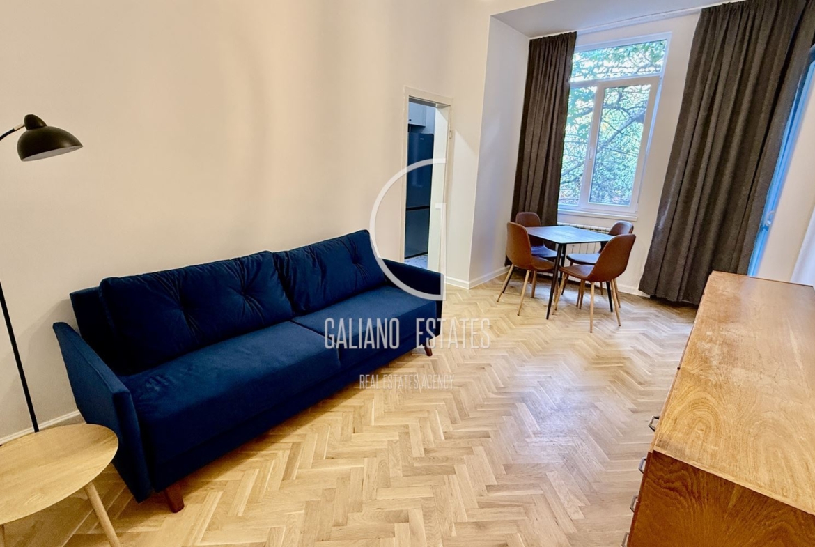 Galiano Estates presents a two-room apartment in the center of Sofia. It is located a few meters from the park in front of the National Palace of Culture, on Frityof Nansen Street. Extremely suitable for both short-term or long-term rental, as well as for living.