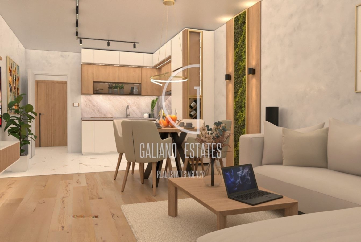 Galiano Estates ви предлага двустаен апартамент в Манастирски ливади изток в сграда Гама, част от комплекс състоящ се от три сгради обградени от зеленина и предстоящия речен парк Манастирски ливади, бягство от бетонната джунгла на големия град.Разположен на минути от Южен парк и центъра на столицата, с лесен достъп до ключови пътни артерии като бул.България, бул.Тодор Каблешков и околовръстен път.По време на изграждане на сградата ще бъдат изградени вътрешно квартални улици, нова канализация и водопроводна мрежа.Сграда Гама ще бъде изпълнена с висококачествени материали от най-висок клас, модерен и удобен, функционален дизайн: окачена вентилируема фасада, дограма Reynaers с троен стъклопакет, шумоизолация, дизайнерски общи части със скрито осветление и стенни облицовки.Предблокова градина с професионален ландшафтен проект, граничеща с бъдещия парк и речното корито, удобна и зелена, тиха и ориентирна на юг.Налични имоти: двустайни, тристайни, четиристайни, партерни с двор, както и с панорамни тераси и подземни гаражи.Гъвкави схеми на плащане според етапа на строителство.По желание на клинет възможност за довършване до ключ.Разпределение на имота:Входно антре, всекидневна с кухненски бокс,спалня, детска стая, баня с тоалетна, тоалетна и тераса.Обща площ 103кв.Изложение:Югоизток