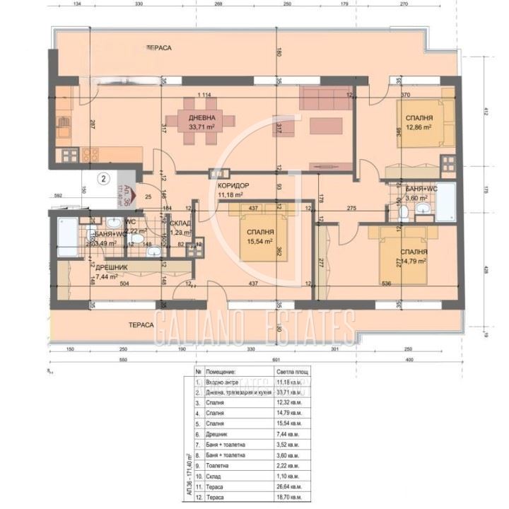 Distribution: entrance hall, spacious living room with kitchen and dining area /34 sq. m./, three bedrooms /one of which with its own bathroom with toilet and walk-in closet/, storage room, bathroom with toilet, separate toilet and two spacious terraces with a unique view of Vitosha and Stara Planina mountains.
