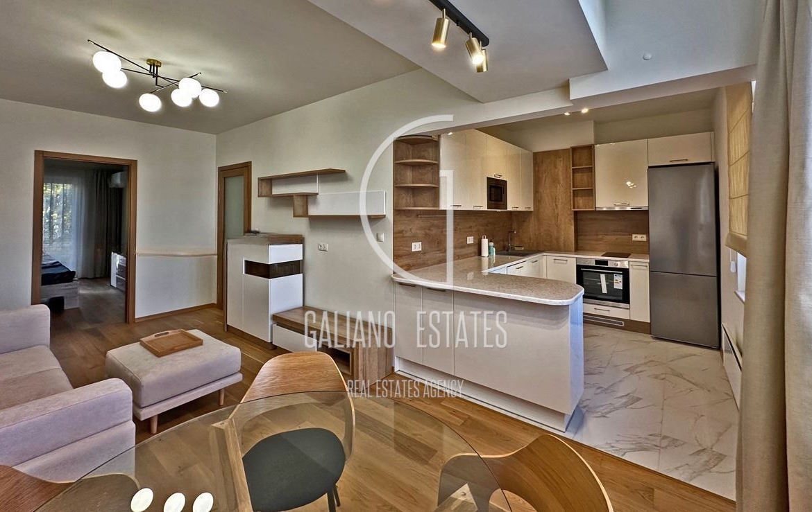 Galiano Estates presents a luxurious three-room apartment in the Lozenets district. The property is located in a renovated three-story solid building with very well-maintained common areas. Layout: living room with dining area, kitchen with a bar, two large bedrooms, entrance hall, bathroom with toilet, separate toilet and balcony. Floor: Third floor above a high basement. There is another apartment above the apartment in the attic space. Area: 82.4 sq.m net built-up area + 16 sq.m basement in the semi-basement with natural light, a total of 98 sq.m excluding the common areas of the building. The basement is suitable for a hobby-office. The exposure is North-South.