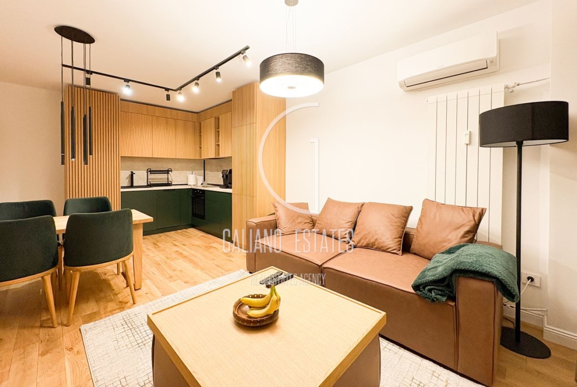 Galiano Estates ви представя бутиков, четиристаен апартамент, разположен на седми етаж, в жилищна сграда с поддържани общи части и асансьор. Апартаментът предлага функционално разпределение и усещане за простор и уют, като цялото обзавеждане е изпълнено с висококачествени материали и мебели по поръчка, по индивидуален интериорен проект. Жилището е със следното разпределение: Входно преддверие, кухня с вградени електроуреди висок клас /AEG-ААА/, дневна с кът за хранене и кът за почивка с излаз на тераса с дейкинг, две спални, детска стая, баня с тоалетна. Настилките в жилището са от естествен паркет. Жилището е много светло, топло, с изключително ниски разходи, с изложение И/З. Изцяло подменена дограма /8 камерна/, изолация /10 см./, нова електрическа инсталация, изцяло подновен водопровод. Апартаментът се продава напълно обзаведен, във вида в който се намира. Отоплението е на централен ТЕЦ, като са монтирани и климатици /HITACHI -AAA/. Районът е изключително озеленен, развит и комуникативен. Имотът е в близост до магазин Лидъл и множество малки магазини, спирки на градски транспорт, в близост до две училища, две дестки градини и две детски площадки. В района паркирането е свободно. Оферта 6534
