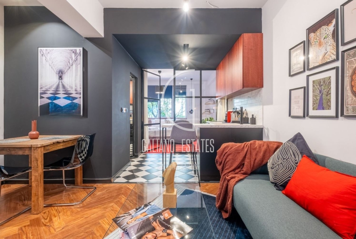 Galiano Estates Ви предлага чудесен дизайнерски едностаен апартамент в Център, на ул. Братя Миладинови. Имота е на първи жилищен етаж. Към апартамента прилежат избено и таванско помещение. С площ от 45 кв.м., пространството е оптимално разпределено и включва: всекидневна с комфортна мека мебел, напълно оборудвана кухня, спална зона с двойно легло и телевизор, както и модерна баня с тоалетна, завършена с елегантен мраморен аккцент. Апартаментът е напълно обзаведен с висококачествени мебели, готов за непосредствено нанасяне. Проектиран, обзаведен и оборудван с цел краткосрочно отдаване под наем и реализира около 90% заетост целогодишно.
