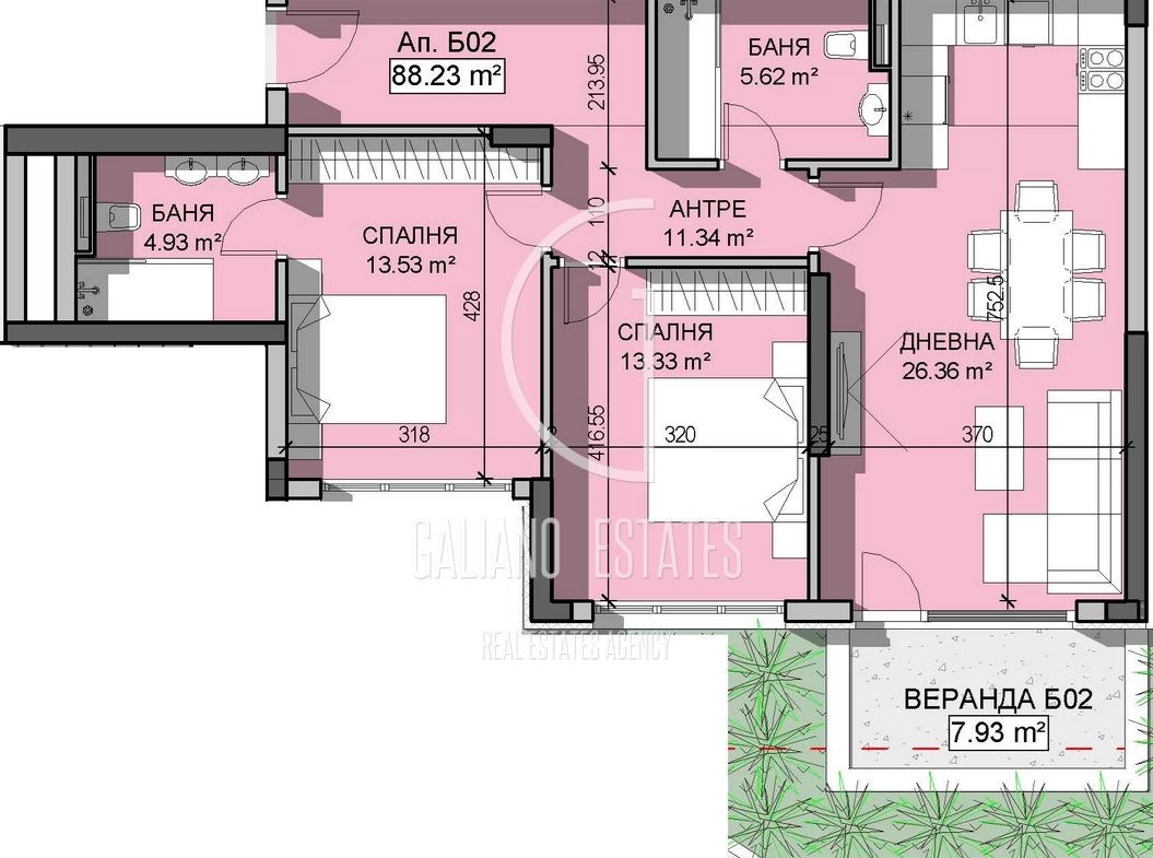 Разпределение: входен коридор, просторна всекидневна с трапезария и кухненски бокс, две спални, две бани с тоалетни и прекрасна веранда.