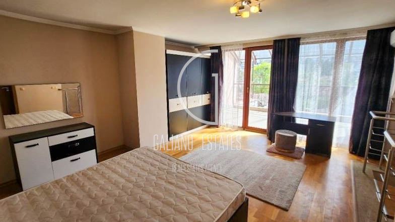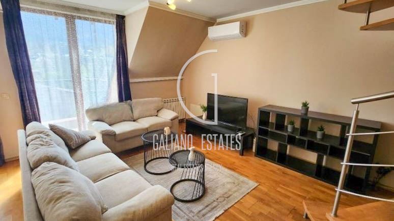 Galiano Estates Ви представя панорамен тристаен мезонет в затворен комплекс само на 200 м. от Околовръстния път с бърз достъп до целия град, а в същото време с усещане за спокойствие и тишина. Комплекса разполага с красива градина и луксозни общи части: стълбище и первази от италиански гранит и словенска дървена дограма със стъклопакети. Мезонета се състои от: първо ниво – входно антре, хол с трапезария и кухня, тераса към хола с изглед към Витоша, спалня с тераса, баня с тоалетна, второ ниво – втора голяма спалня с баня с тоалетна и голяма тераса с изглед към Витоша. Към апартамента има и голямо и високо мазе. Оферта № 5901