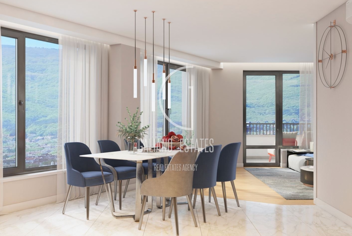 Предлагания апартамент се намира на трети жилищен етаж от общо шест. Има следното разпределение: входно антре, просторна всекидневна с кухня, две спални, две бани с тоалетна, мокро помещение и тераса.