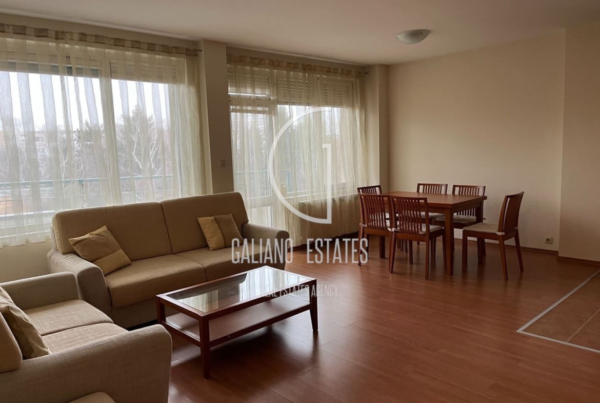 Galiano Estates ви представя просторен тристаен апартамент под наем в ж.к. Гоце Делчев с много зеленина и панорама гледка към Витоша. Имотът се намира в непосредствена близост до Южен парк, Мол България, Мол Парадайс и удобен градски транспорт. Разпределение: входно антре, просторен хол с кухненски бокс, две самостоятелни спални, баня, отделна тоалетна, тераса. Апартаментът е вътрешен, изключително топъл през зимните месеци. Отопление: ТЕЦ и Климатици. Малка тухлена сграда с отлично поддържани общи части, заключващ се вход и асансьор. Към апартамента може да се наеме самостоятелен гараж (22 кв.м). Жилището се отдава дългосрочно, напълно обзаведено и готово за нанасяне.